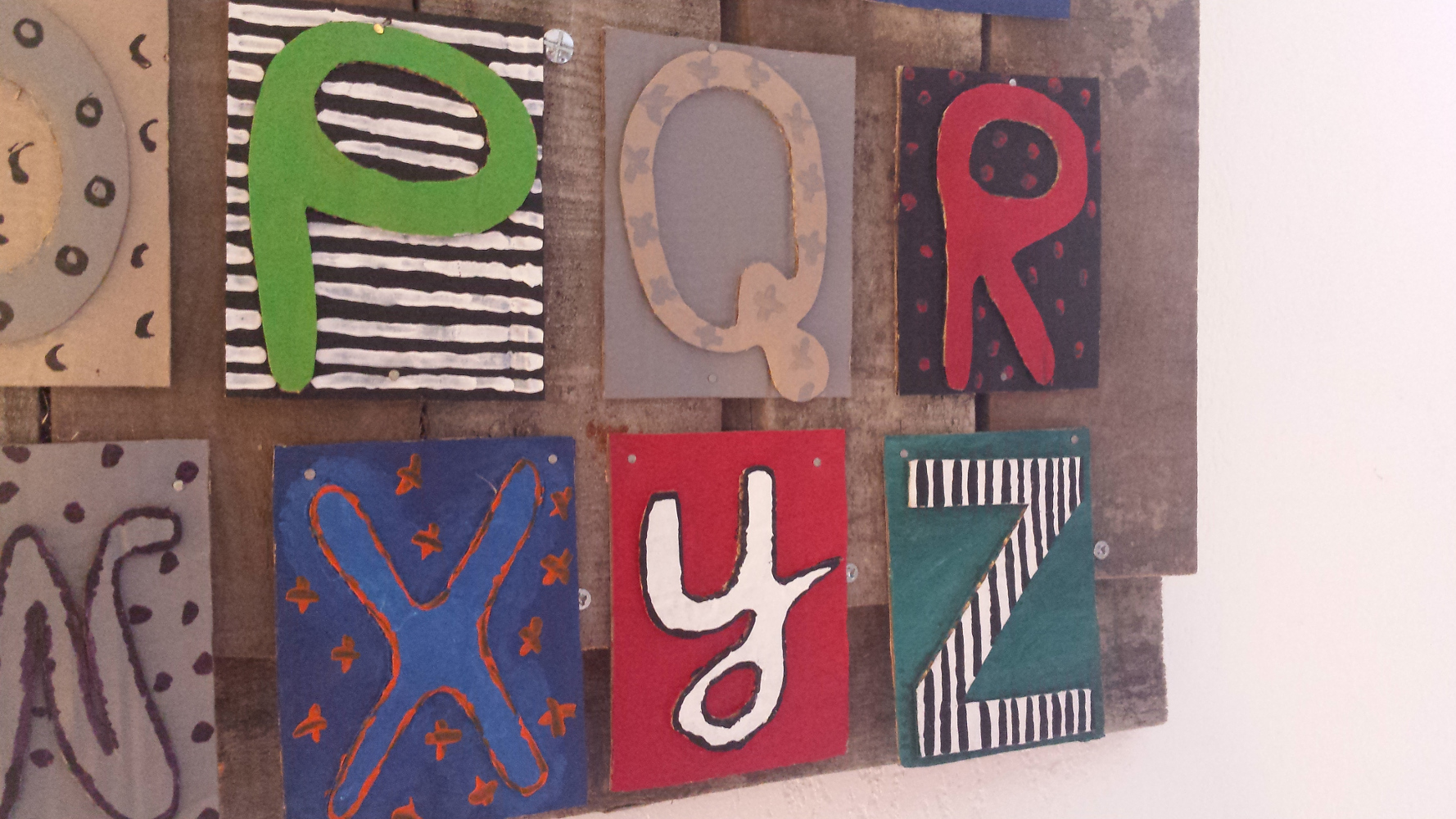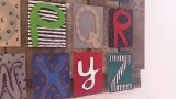 Le tableau est composé de quatre planches poncées et vieillies naturellement. Les encadrés et lettres sont réalisés en carton, les formes découpées au scalpel. Chaque support et lettre peints à la peinture acrylique. Modèle unique.